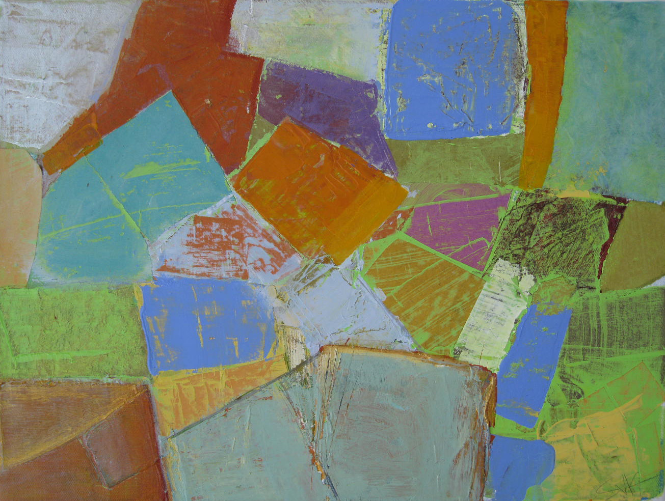 Electric colors are officially in season. Torn paper, acrylic paint and pencil on canvas; 12″ x 16″
